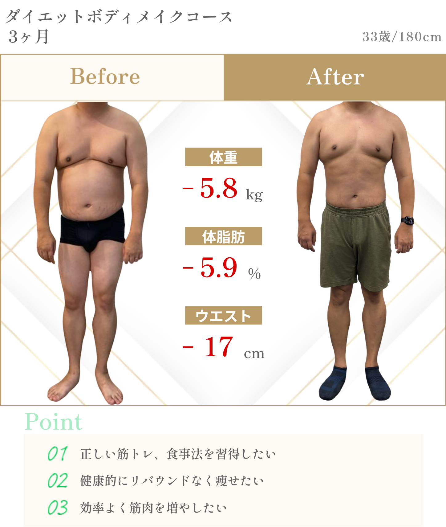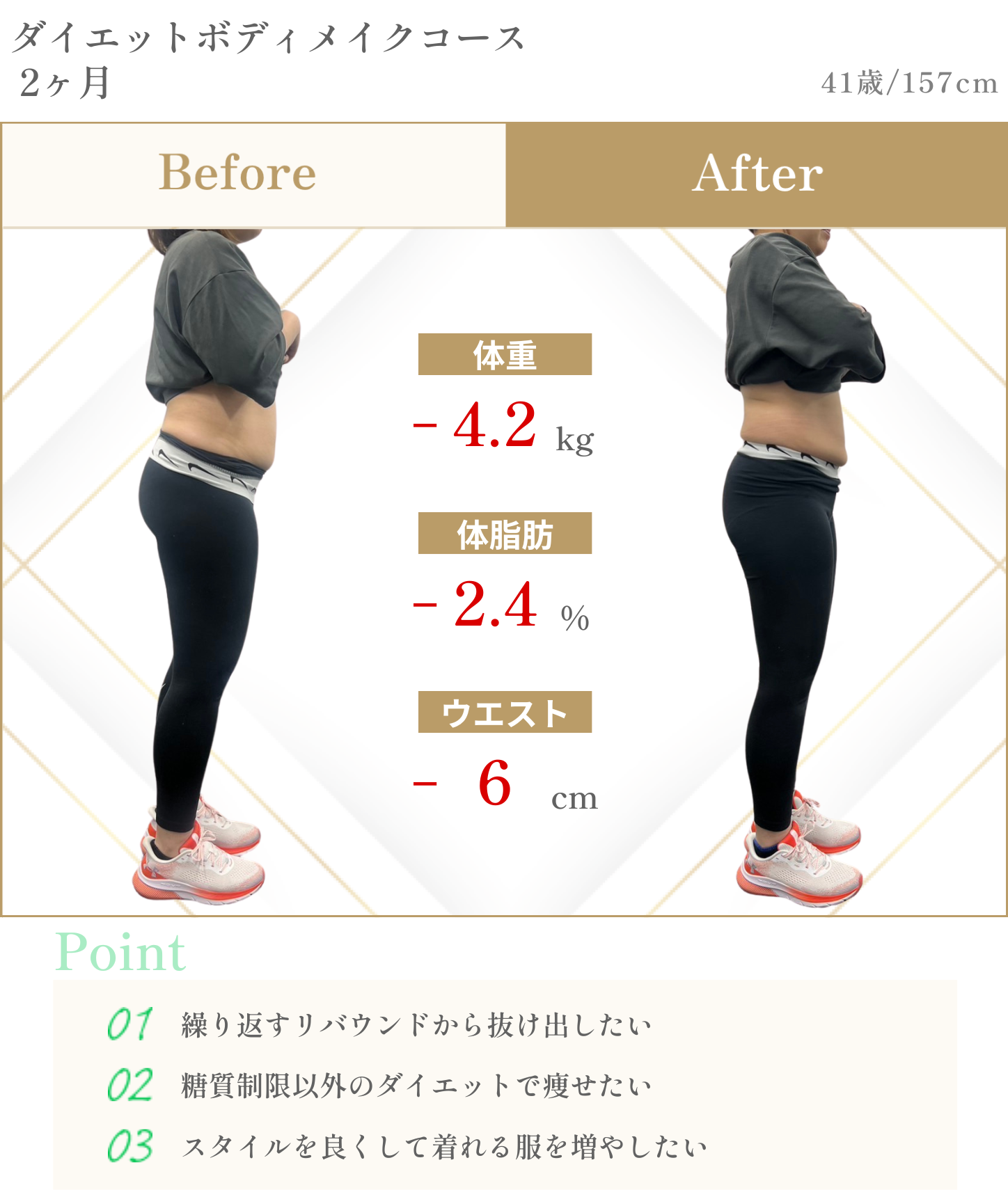 食事は炭水化物を食べながら健康的に体脂肪を落とすので、過度なダイエットに比べストレスフリーで継続しやすいため、コース終了後もリバウンドなしで永久的に健康的な身体を手に入れることができます。